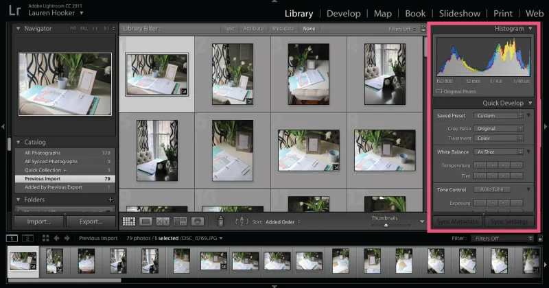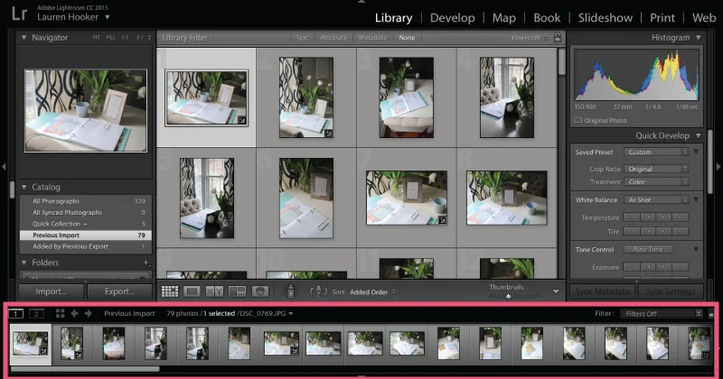 The film strip at the bottom of the screen shares thumbnails of the photos within each collection or folder. It isn’t quite as helpful in the Library module as it is in the Develop module, but we'll get to that in the coming weeks.