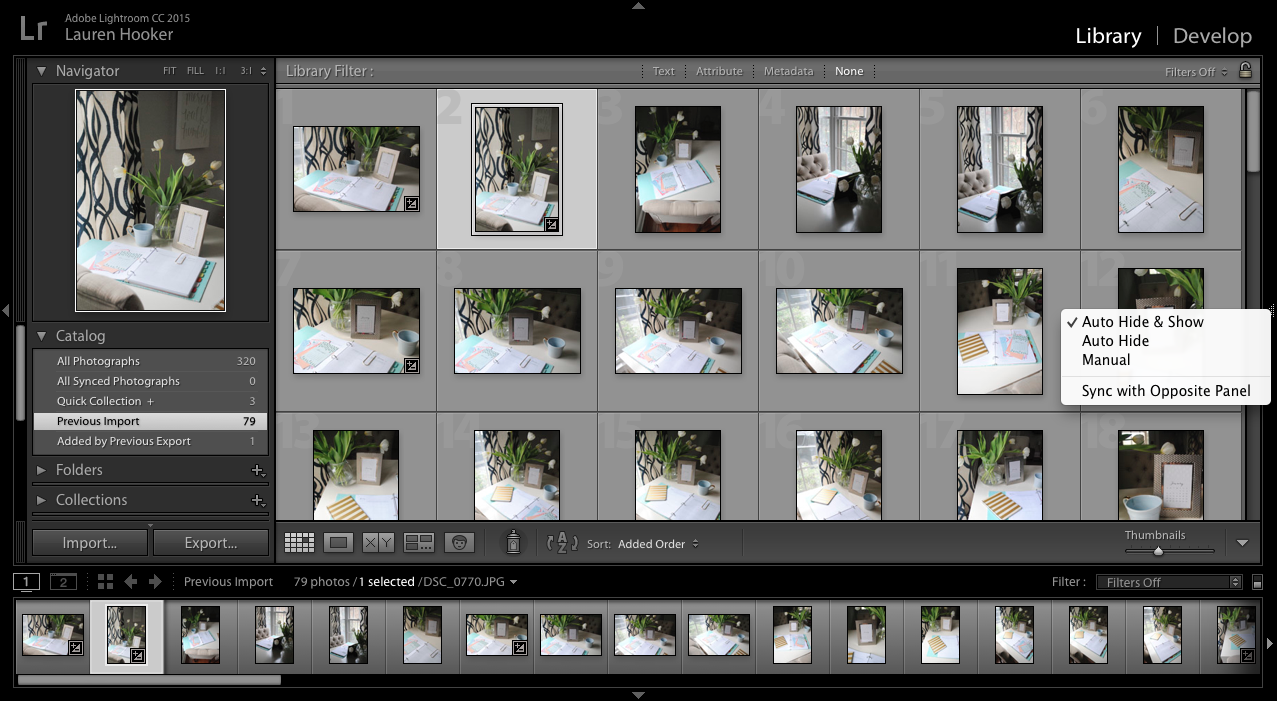 Because Lightroom is all about your photos, it can be a little distracting to have every toolbar, menu, and panel open within the program at once. Thankfully, Lightroom helps you cut back on clutter and optimize your workspace to create a better workflow.