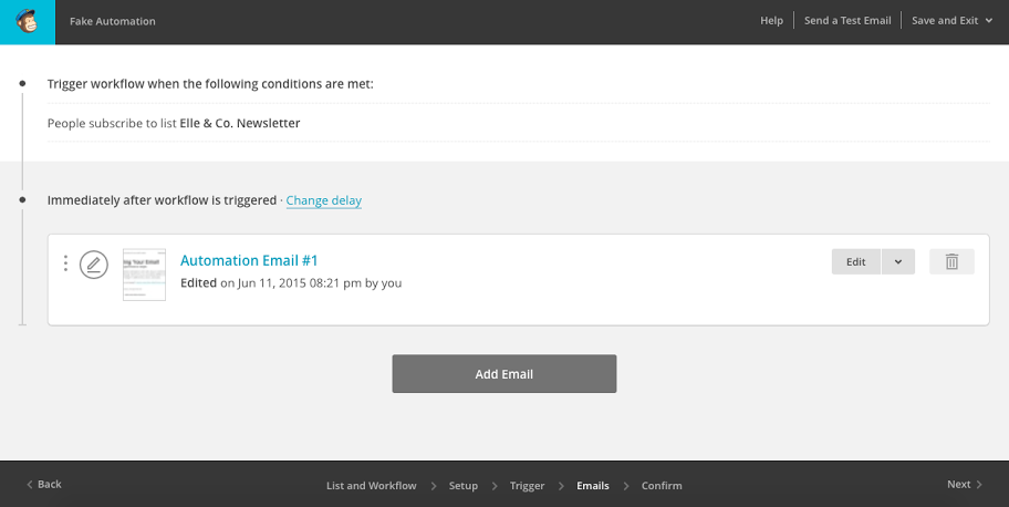 Once you've worked through setting up your campaign, Mailchimp will bring you back to the Automation Workflow page with your selected email. Make sure to double-check the delay to ensure that the email will be sent out at the appropriate time.